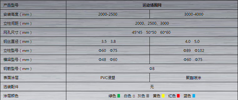體育場圍網具有防腐、防老化、抗曬、耐候、色彩鮮亮、網面平整,強力張緊,不易受外力撞擊變形、現場施工安裝、靈活性強(可根據現場要求隨時調整造型和尺寸)的有點。可選顏色:藍色、綠色、黃色、白色等。