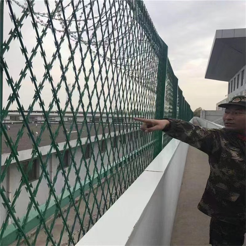 監獄安全網圍欄頂部按照要求安裝蛇腹形刀刺網,立柱頂部的V型直接兩個側臂焊接有專用的刺網勾,是每個側架設三道熱鍍鋅鋼絲,形成一個V型槽,然后把刀刺網放到上面,再用配套卡扣把鋼絲和刀刺網連接到一起,如果V型架內安裝V型網架,安裝就更簡單了, 直接把刀刺網連接到V型網上面就可以了。
