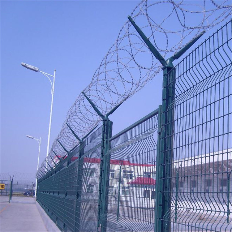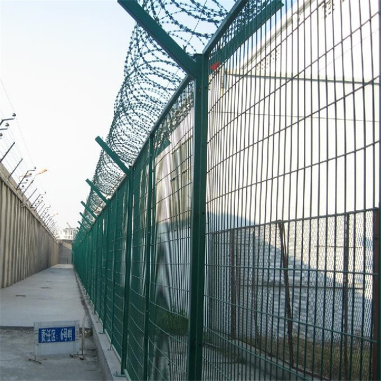 監獄鋼網墻又稱作“Y型安全防御護網”,是由V型支架立柱,加強型焊接片網,安全防盜連接件和熱鍍鋅刀片刺籠組成強度和安全防御性級別很高。近年來,被廣泛應用在監獄,軍事基地等高安全場所。在監獄鋼網墻頂部加裝刀片剌絲、刀片剌繩后又很好的增強了安全防護性能。采用電鍍、熱鍍、噴塑、浸塑等防腐形式,具有很好的抗老化抗曬、耐候等特點。產品造型美觀、花色多樣,既起到圍欄作用,又起到美化作用。由于具有安全性高、防攀爬能力好網片連接方式采用特制sbs緊扣件,有效防止人為的破壞性拆卸橫向四道折彎加強筋,使網面強度顯著增加。