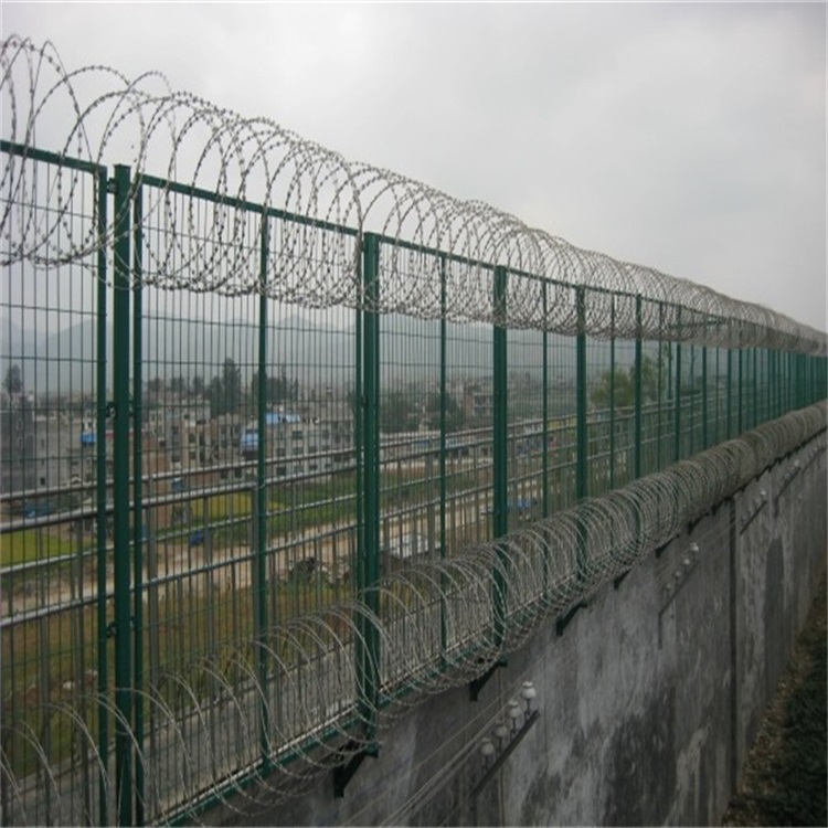 搭配使用。V型支架的加裝是為了將蛇腹形刀刺網(wǎng)固定在鋼網(wǎng)墻頂部,從而有效的增加監(jiān)獄看守所鋼網(wǎng)墻的防攀爬性和安全性。V型支架加裝防拆卸刀刺網(wǎng)。
